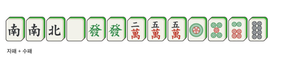 이후 주사위를 사용해 패산에서 선(先)은 14개의 패를 가지고 오고 나머지 3명은 13개의 패를 가져와 다른 사람들에게 패를 안 보이게 배열하면서 대국이 시작됩니다. 패산과 각자 패들 사이의 공간은 ‘강(江)’을 뜻하는 ‘하(河)’라고 합니다.