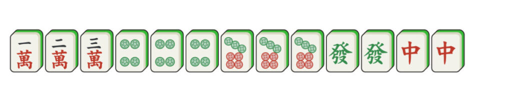 아래 그림은 멘젠 상태에서 팅파이를 만든 경우입니다. 發 패 또는 中 패를 쯔모하면 역을 완성하면서 마작의 한 국(판)이 종료됩니다.