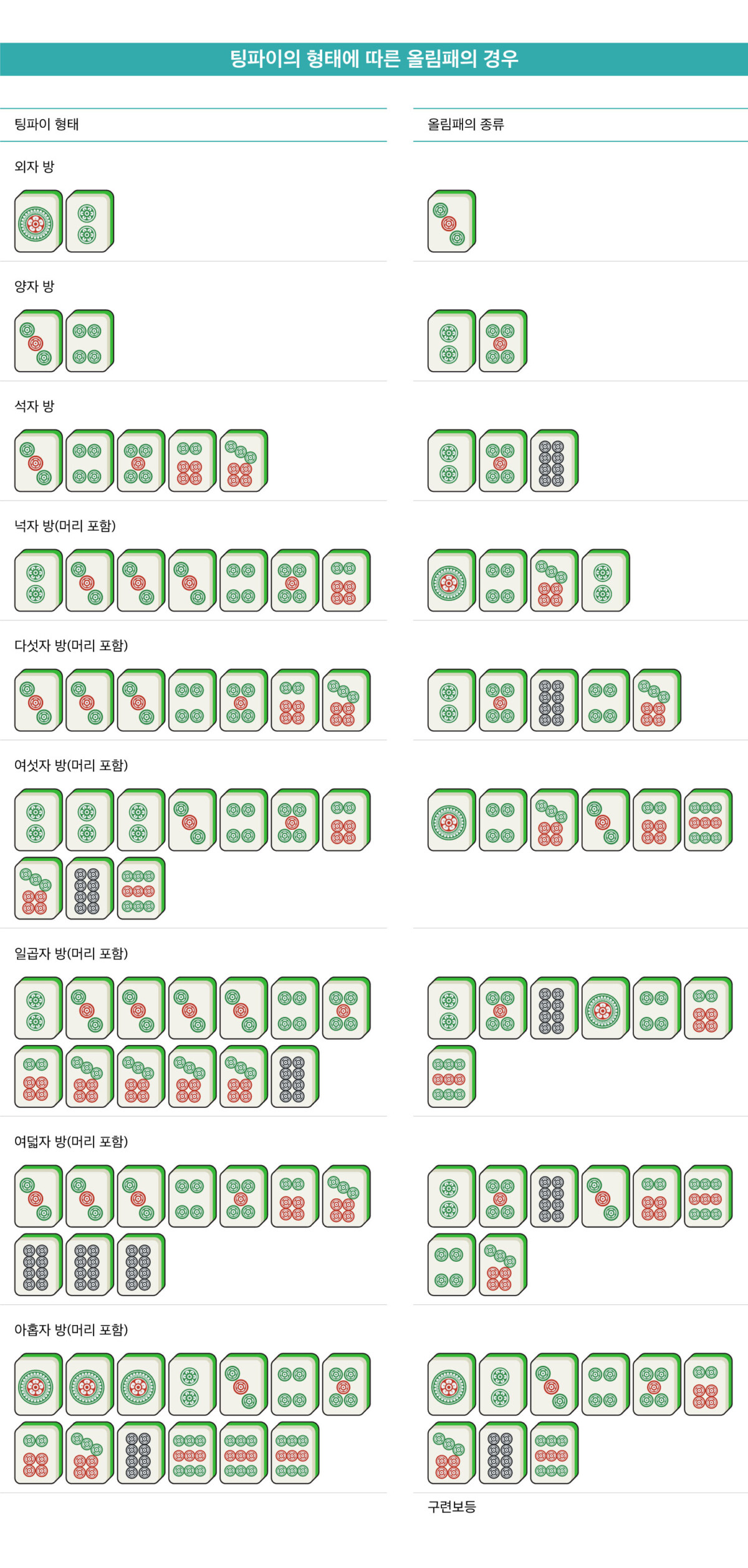 팅파이 상태에서 화료하기 위해 필요한 올림패는 최소 1개부터 최대 9개까지 있을 수 있습니다. 중국이나 일본 마작의 경우 최대 13개의 올림패가 가능합니다. 마작에서 승리하기 위해서는 가급적 올림패의 숫자가 많은 팅파이를 만들어야 합니다.
