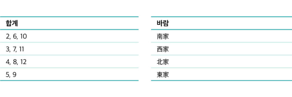 패배의 방법도 몇 가지가 있는데 가장 보편적인 경우를 소개하겠습니다. 앞서 일련의 과정을 거쳐 동가로 결정된 사람이 다시 주사위 2개를 던집니다. 주사위가 1개밖에 없으면 두 번 던지면 됩니다. 주사위를 던질 때는 정사각형 모양의 패산 안으로 살짝 던져 넣으면 됩니다. 그 두 숫자의 합이 어느 바람이 쌓은 패산에서 배패가 시작되는지 결정합니다. 주사위 두 숫자의 합계에 따라 결정되는 바람은 다음과 같습니다.