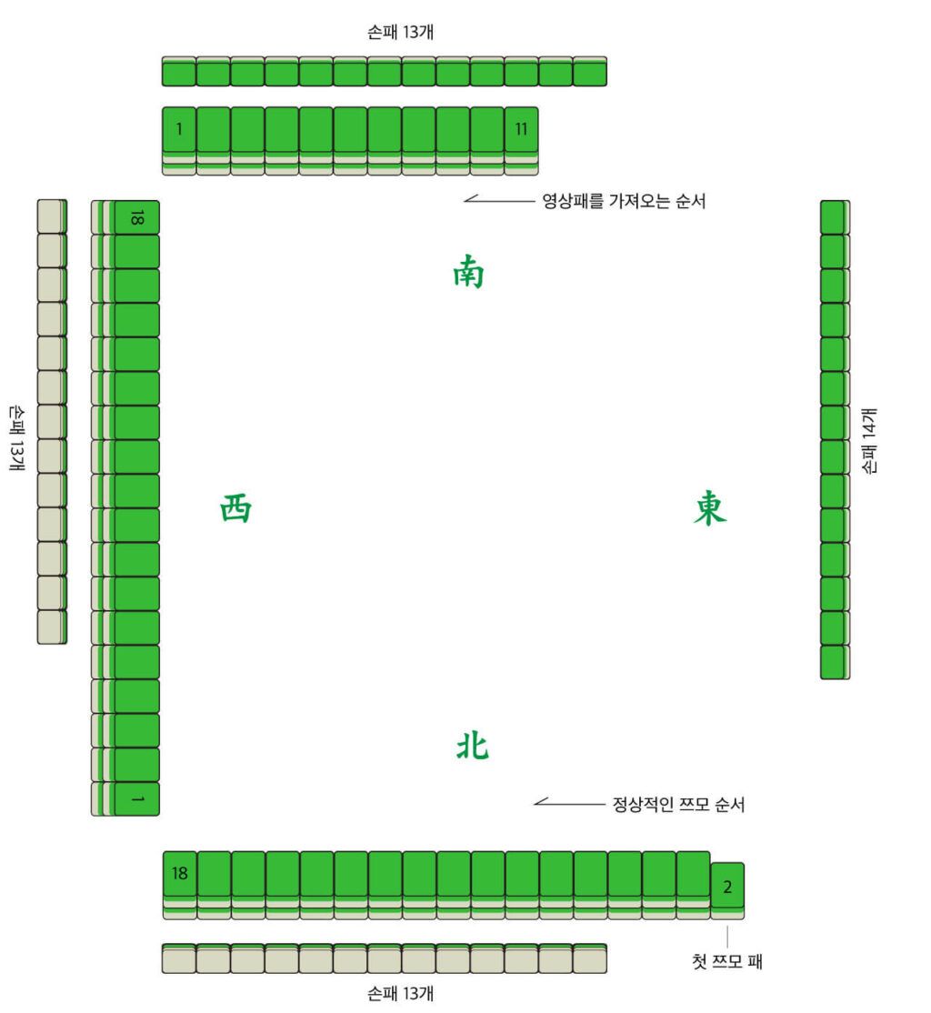 마지막으로 東家가 2개의 패를 가지고 오고 南家, 西家, 北家 순으로 각 1개씩 패를 더 가져오면 다소 길었던 패 섞기 및 나누기 과정이 종료됩니다. 東家가 패를 1개 더 가져오는 것은 쯔모하는 시간을 단축하기 위한 목적입니다.